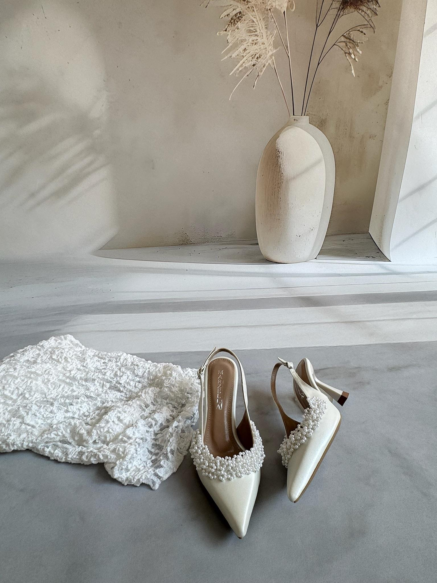 MZR inci detaylı özel tasarım sedef rengi topuklu ayakkabı